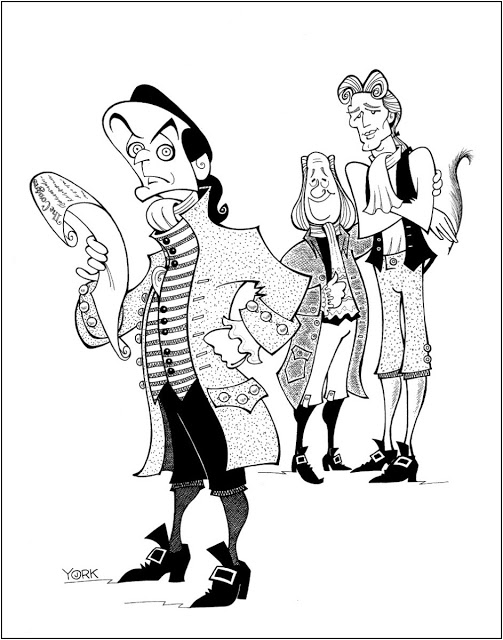 | Original caricature by Jeff York of the Broadway play “1776.” (copyright 2017) |