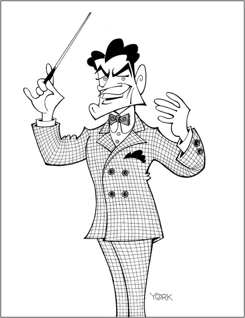| Original caricature by Jeff York of Robert Preston in “The Music Man” on Broadway. (copyright 2017) |