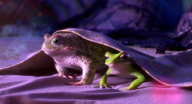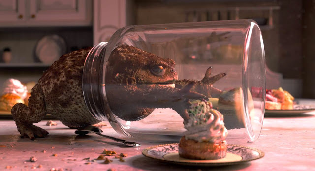 The story of GARDEN PARTY seems at first to merely be about a couple of frogs who wander into the estate of a wealthy man, taking advantage of all the splendor in their midst. At the beginning of this 7-minute entry from France, a bullfrog and a smaller frog check out the pool which is noticeably unattended. Windows and doors to the mansion are open too, so a couple of frogs venture inside and discover all sorts of marvels in the kitchen. But why is the house so empty?