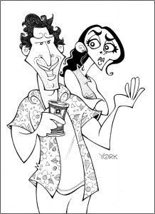 Original caricature by Jeff York of Andy Samberg and Cristin Milioti in PALM SPRINGS (copyright 2020)