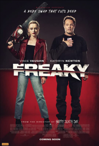 Mary Rodgers’s durable children’s novel Freaky Friday has yielded oodles of screen interpretations including four done by the Walt Disney Corporation alone. The newest take on the material is an R-rated horror/comedy called FREAKY, opening this Friday the 13th in theaters, and this time out, the body-switching foregoes mom and daughter for a beleaguered teenager and serial killer. The revenge tale that ensues, with the high schooler cutting her classmates down to size, practically writes itself. Indeed, FREAKY plays out as a crass and vicious exercise, albeit one that is quite a hoot. And its best laughs come from the film’s two leads all in on pimping their own screen personas.